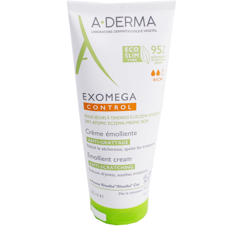 La Crème Emolliente Anti-grattage EXOMEGA CONTROL discount d’A-DERMA, le soin protecteur et apaisant des peaux sèches à tendance à l’eczéma atopique qui démangent avec grattage du visage et du corps de toute la famille (dès la naissance, enfant à adulte), dans votre parapharmacie discount.