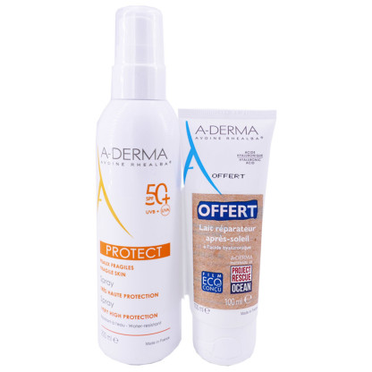 Le lot ADERMA contient le Spray SPF50+ Très haute protection (200ml) et le Lait Réparateur Après-soleil (100ml) offert, destiné aux peaux fragiles, à prix discount dans votre parapharmacie en ligne. Visage et Corps