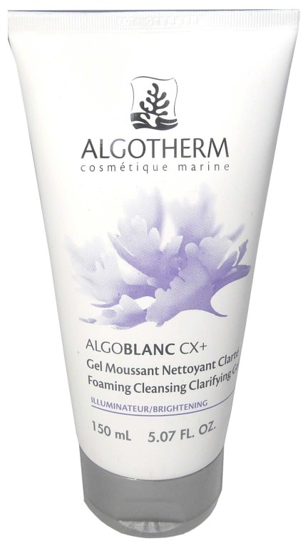 La gamme ALGOBLANC est composée de soins anti-taches pour redonner au visage de la clarté grâce aux propriétés des algues marines. Le Gel moussant nettoyant clarté à base du complexe Algoblanc CX+, et composé d’algue brune Dictyopteris Membranacea, de micro-algue bleue, de lys blanc, d’un dérivé de vitamine C et d’extrait de fleur de cerisier, élimine toutes les impuretés en désincrustant, lutte contre l’apparition des signes de l’âge et lisse les rides, estompe les taches cutanées, purifie la peau et éclaircit le teint. Sa texture moussante et onctueuse sera un vrai régal pour la peau. Après le soin, la peau est nette, et retrouve tout son confort et sa fraîcheur. Le teint est éclatant.