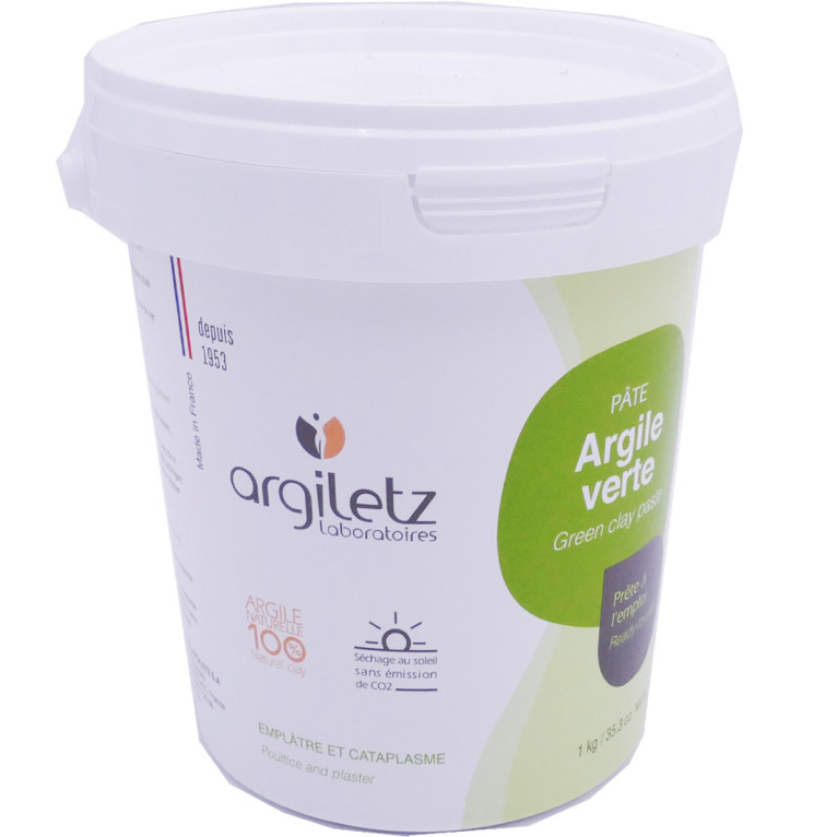 Argiletz est une marque spécialisée depuis 1953 dans le développement de produits à base d’argile, cette matière naturelle généreuse aux multiples bienfaits sur l’homme. Issue de carrières françaises, naturellement séchée au soleil, l’argile ARGILETZ ultra-riche en minéraux possède des qualités incomparables pour la peau. L’argile verte prête à l’emploi, est une argile brute illite verte qui s’utilise en emplâtre en cataplasme ou en masque. Elle possède des vertus adoucissantes, purifiantes, décongestionnantes, apaisante et tonifiantes. Elle est idéale pour soulager les zones sensibles du corps (articulations douloureuses…)