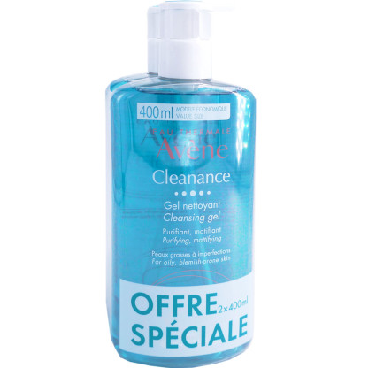 AVENE CLEANANCE GEL NETTOYANT LOT DE 2X400ML, est un lot de soin d’hygiène dans votre parapharmacie en ligne à prix discount, qui nettoie tout en douceur les peaux grasses à problèmes du visage.