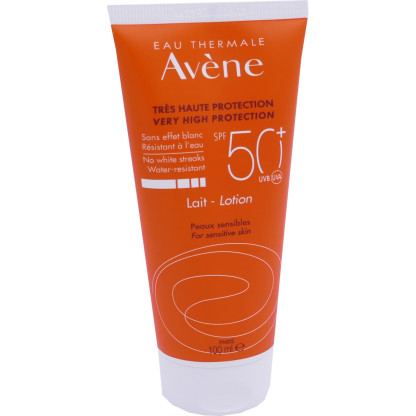Lait solaire SPF50+ d'AVENE dans votre parapharmacie en ligne à prix discount, la très haute protection solaire des peaux sensibles au soleil, exposées à un fort ensoleillement. Visage et corps.