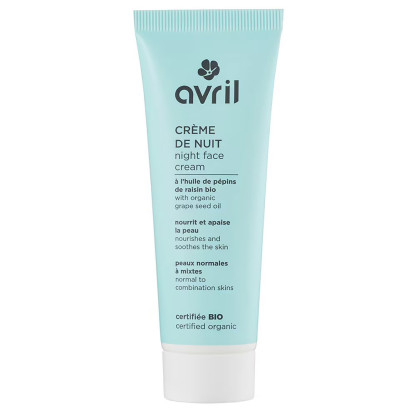 La marque AVRIL propose une crème de nuit bio pour les peaux normales à mixtes. Elle est formulée à base d'huile d'amande douce et de pépins de raisin bio pour hydrater la peau. Sa texture légère et non grasse pénètre rapidement et laisse la peau douce et hydratée. La crème de nuit AVRIL est un soin idéal pour les peaux normales à mixtes. Certifié bio par Ecocert