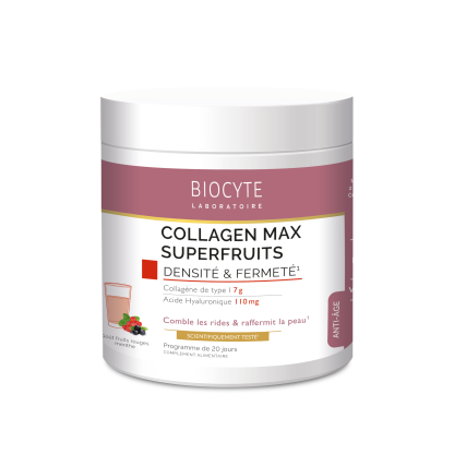 Le complément alimentaire Collagen Max Superfruits discount du laboratoire Biocyte, sous forme de poudre à diluer est à base de collagène hautement dosé et de vitamine C qui qui contribue à la formation normale de collagène pour assurer la fonction normale de la peau dans votre parapharmacie en ligne à prix discount.