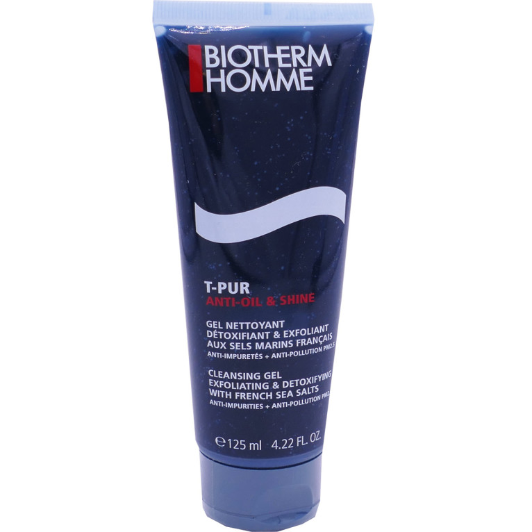 La gamme T-Pur Anti-Oil & Shine Homme des laboratoires BIOTHERM est composée de soins purifiants, désincrustants et nettoyants pour les peaux à tendance grasse. Le Gel Nettoyant Détoxifiant & Exfoliant T-Pur Anti Oil&Shine élimine toutes les impuretés et les particules de pollution PM2.5, resserre les pores de l'épiderme pour réguler le sébum et éliminer l'excès pour limiter la peau grasse, et hydrate intensément en absorbant l'eau en profondeur pour limiter le dessèchement grâce aux extraits anti-bactériens de sels marins français (riche en oligo-éléments). Dès le premier soin, le grain de peau est affiné, la peau est éclatante, nette et purifiée, sans brillance tout au long de la journée.