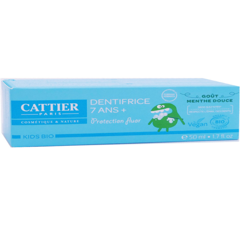 Le laboratoire CATTIER a conçu des produits pour le soin et le bien être de toute la famille à base d’ingrédients naturels bio et d’argiles sans silicone, sans paraben, sans produits chimiques. Le Dentifrice 7 ans est spécialement formulé pour favoriser l’apprentissage du brossage de dents définitives chez les petits dès 7 ans. Sans sulfates, il est composé d’un dosage de fluor adapté aux enfants, de gel d’aloe vera bio (riche en minéraux et vitamines) et de stevia, pour assurer une protection efficace contre les caries en respectant les gencives sensibles et l’émail des premières dents définitives en stimulant la salivation pour limiter la multiplication des bactéries responsable de la plaque dentaire. Son goût fruité plaira aux plus petits pendant le brossage !