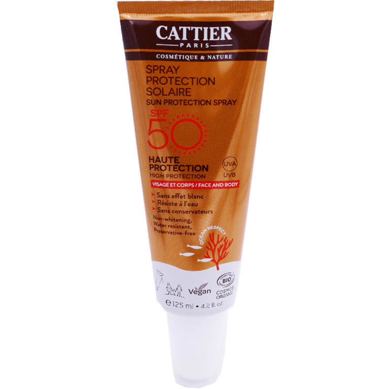 Le Spray Protection Solaire SPF50 discount de CATTIER, une très haute protection solaire dans votre parapharmacie en ligne à prix discount, grâce à ce soin solaire minéral et naturel conçu pour protéger intensément toutes les peaux de toute la famille. Visage et corps