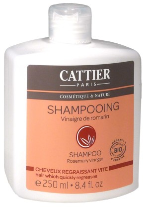 Le laboratoire CATTIER a conçu des produits pour le soin et le bien être de toute la famille à base d’ingrédients naturels bio et d’argiles sans silicone, sans paraben, sans produits chimiques. Le shampooing Vinaigre de romarin prend soin des cheveux qui regraissent vite tout en assainissant le cuir chevelu pour retrouver son équilibre naturel grâce à sa richesse en vinaigre de romarin et huiles essentielles, et à l’extrait de fleur d’hibiscus. Il va renforcer, tonifier, protéger, nourrir, hydrater, et adoucir les cheveux de la racine jusqu’aux pointes grâce à sa richesse en huiles essentielles, en vinaigre de plantes (lavande, romarin, sauge, thym), aux protéines de blé, à la glycérine, ainsi qu’à l’aloe vera bio. Après le shampooing, le cuir chevelu est apaisé de toute irritation, les cheveux sont souples et légers, brillants de santé et faciles à coiffer.