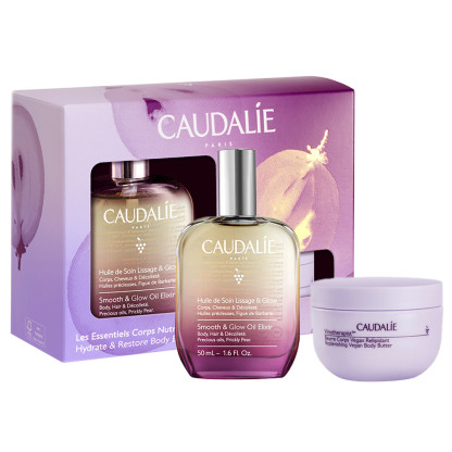 Coffret Les Essentiels Corps 2 Soins en vente en ligne sur le site de votre parapharmacie à prix discount : Huile de soin Lissage & Glow (50ml), Beurre Corps vegan Relipidant Vinotherapist (40ml) offert.