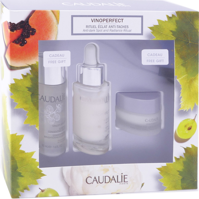 Le coffret « Vinoperfect Rituel Eclat Anti-Taches » de CAUDALIE discount, 3 soins anti-âge et éclat dans votre parapharmacie en ligne à prix discount, pour révéler au quotidien la beauté de la peau : Vinoperfect Sérum Eclat Anti-taches (30ml) ; Crème Nuit Glycolique Anti-taches Vinoperfect (15ml) ; Vinoperfect essence concentrée eclat (50ml)