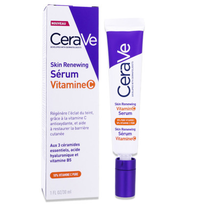 CERAVE Skin Renewing SERUM VITAMINE C 30ML est en vente en ligne sur le site de votre parapharmacie à prix discount, offrant une solution pour le soin du visage et du cou adaptée à tous types de peaux.