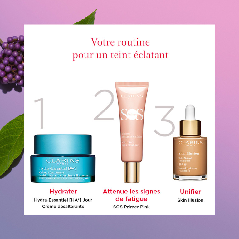Formulé avec un Complexe Microbiote à base de deux algues marines, la chlorella et la laminaire, ainsi que des polyphénols de fleur de safran, qui agissent en synergie pour apaiser et protéger la peau. Le soin contient de l'extrait de callicarpa, reconnu pour son effet éclatant, aide à raviver les teints ternes et à réduire les signes de fatigue. Les Laboratoires Clarins ont choisi cet extrait en raison de son aptitude à préserver la microcirculation sanguine. Il joue un rôle essentiel dans la protection des cellules face aux agressions extérieures, tout en favorisant un teint lumineux..Grâce à son Complexe High-Lumitech, il illumine le teint tout en offrant une protection anti-pollution. Sa teinte rose est idéale pour apporter une touche de luminosité un éclat naturel à votre visage. Grâce à sa formule hydratante, il prépare la peau avant le maquillage tout en lui offrant un effet lissant.