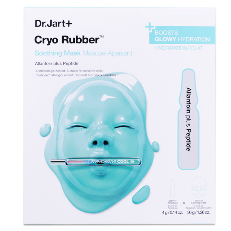 Inspiré des soins du visage coréens par cryolipolyse, ce masque en caoutchouc rafraîchit instantanément la peau. Le laboratoire Dr Jart+ propose une formule innovante combinant un masque hydrogel et une ampoule à la texture sérum. L'ampoule contient de l'allantoine qui aide à apaiser la peau et des peptides à 2 % qui soutiennent la fonction de la barrière cutanée. Ces ingrédients actifs sont reconnus pour leur capacité à contribuer au maintien d'une peau d'apparence saine et à soutenir la fonction de protection naturelle de la peau. L'allantoine participe également à l'hydratation de la peau, favorisant un teint éclatant et revitalisé.