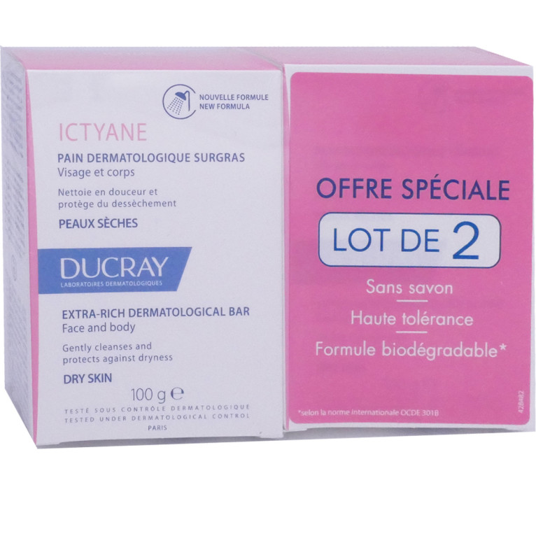 Le pain dermatologique surgras Ictyane de DUCRAY à prix discount dans votre parapharmacie en ligne, le soin d’hygiène qui s’utilise tous les jours pour nettoyer et protéger les peaux sèches et fragiles du corps et du visage de toute la famille (à partir de 18 ans).