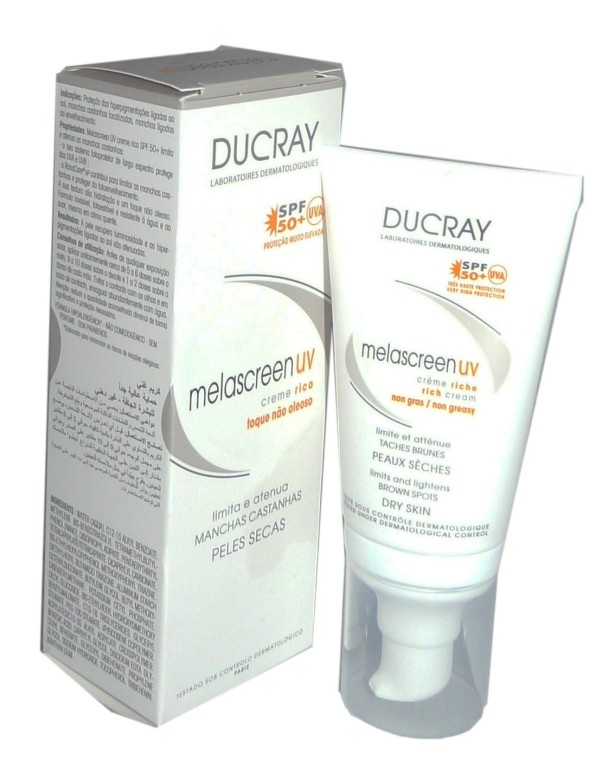 La gamme MELASCREEN du laboratoire Ducray est composée de soins dépigmentants destinés à redonner éclat et beauté au visage, décolleté et aux mains. La crème riche Melascreen UV de DUCRAY est un soin dépigmentant et photoprotecteur à base d’un nouveau système filtrant breveté UVB/UVA (SPF50+) composé de filtres et écrans organiques à large spectre, et composé de RonaCareAP qui est un nouvel actif, ainsi que de vitamine E. Grâce à cette composition, la peau est protégée des effets néfastes du soleil et de l’apparition de nouvelles taches brunes, et les taches brunes sont estompées pour retrouver un teint unifié. Sa texture fine, légère et non grasse qui pénètre rapidement à l’application est un vrai plaisir pour la peau. Dès l’application, la peau est protégée, et unifiée.