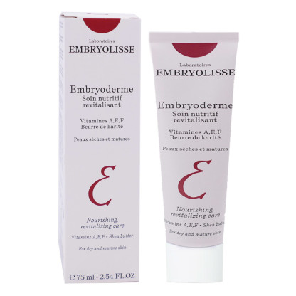 Parce qu’une peau bien nourrie et hydratée est plus lisse et rebondie, les formules des Laboratoires Embryolisse apportent l'essentiel : tous les nutriments et l'eau dont la peau a besoin pour être en pleine santé, embellie et rajeunie. Élaborées sous contrôle pharmaceutique, testées par des dermatologues, les formules Embryolisse intègrent les justes actifs, les justes doses et conviennent aux peaux les plus sensibles. EMBRYODERME d’Embryolisse est un soin nutritif et revitalisant pour un visage toujours plus éclatant grâce aux actifs protecteurs, vitalisants, nourrissants et hydratants d’origine naturelle. L’action protectrice et lissante est apportée par le collagène et l’élastine pour une peau qui retrouve vitalité et tonicité, l’action réparatrice et anti-sècheresse grâce aux actifs nourrissants et hydratants d’origine naturelle produisent un effet apaisant sur le confort et les signes de sècheresse. Sa texture riche laisse la peau douce, souple et lisse. Boostée, réconfortée, tonique et lumineuse, la peau est parfaitement protégée des agressions extérieures et de la sècheresse. Tolérance testée sous contrôle dermatologique.