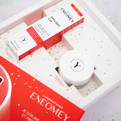 Le Coffret « Je sublime le présent et prépare l’avenir » discount de ENEOMEY le pouvoir anti-âge de la cosmétologie dynamique, dans un coffret pour révéler l’énergie de la peau et son éclat jour et nuit, dans votre parapharmacie en ligne à prix discount : Daylight C20 (30ml) ; Stim Renew 8 (15ml) offert. Visage