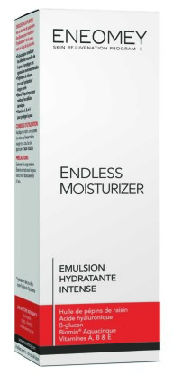 Issus de la cosmétologie dynamique, une alternative non invasive à la chirurgie esthétique, les produits mene&moy ENEOMEY sont composés de principes actifs fortement dosés et redoutablement efficaces sur les désordres cutanés liés au vieillissement cellulaires : la vitamine C stabilisée et l’acide glycolique. Endless Moisturizer est un soin concentré en vitamines A, B et E, en huiles de pépins de raisin et d’olive, en acide hyaluronique et ß-glucan, spécialement conçu pour hydrater en profondeur, renforcer les cellules dermiques, et protéger intensément les peaux déshydratées à pores dilatés.