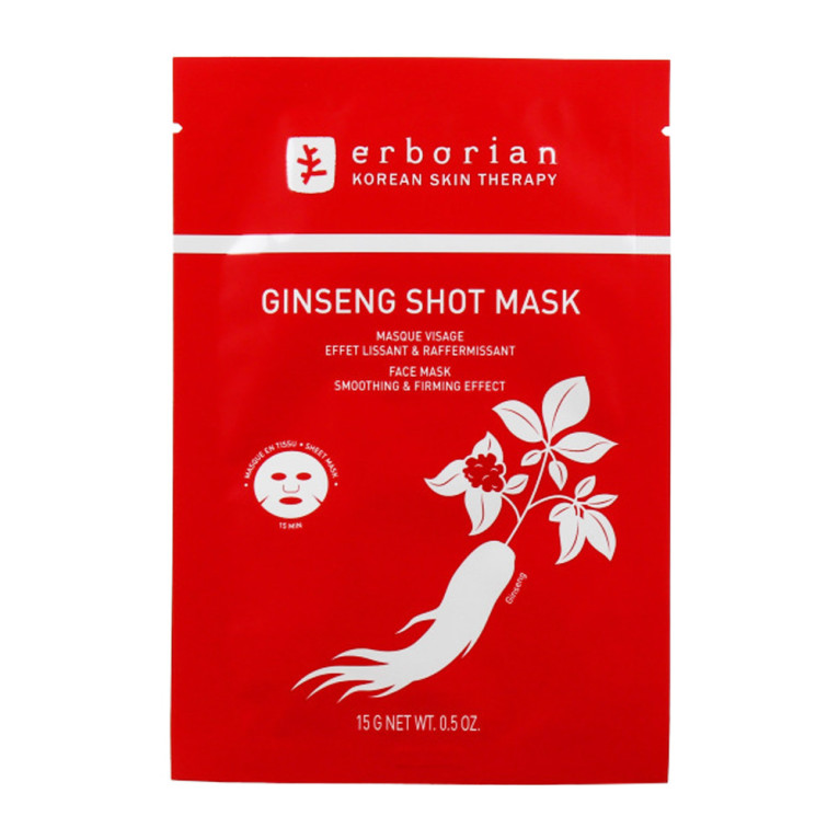 Le laboratoire ERBORIAN conçoit des produits cosmétiques inspirés des traditions coréennes contenant des herbes coréennes pour redonner à la peau de l’éclat. Les Shots masks d’ERBORIAN sont des masques en tissus de fibres lisses de cellulose gorgé de sérum en grande quantité, inspiré de la tradition coréenne et la haute technologie, à appliquer sur le visage pour des résultats remarquables sur la peau. Ginseng Shot Mask d’ERBORIAN contient des actifs fortement concentrés aux pouvoirs de diffusion intenses dans la peau pour des résultats rapides. Composé de ginseng blanc, d’allantoîne, de lacinamide et dénosine, il va protéger au quotidien la peau des agressions quotidiennes et du vieillissement prématuré, diminuer les signes de l’âge pour retrouver une peau lisse, raffermir, redonner de la clarté à la peau, nourrir et intensément hydrater la peau. Dès le 1er soin, la peau parait rebondie et raffermie, elle est douce, souple et lisse, le teint retrouve son éclat, les signes de l’âge sont estompés. Testé sous contrôle dermatologique