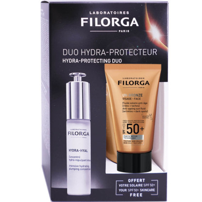 Le Duo « Hydra-Protecteur » de FILORGA dans votre parapharmacie en ligne à prix discount, 2 soins inspirés de la médecine esthétique aux vertus anti-âge puissantes, protectrices et hydratantes pour préserver la beauté de la peau et la réconforter au quotidien : Hydra-Hyal Concentré Hydra-Repulpant Intense (30ml) ; UV-Bronze Fluide Solaire Anti-Âge SPF50+ (40 ml) Offert. Visage