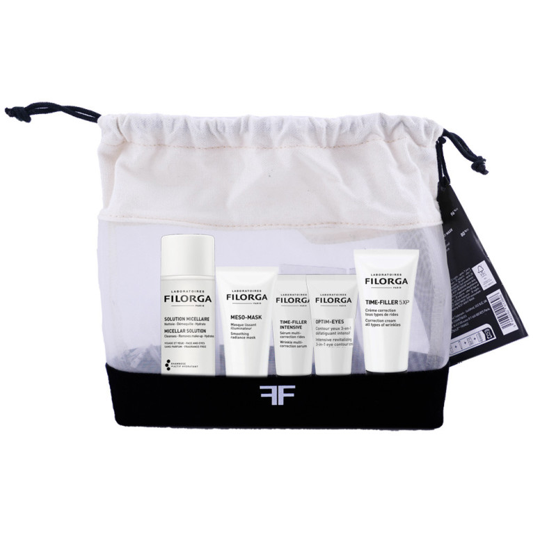 La trousse « Vos Essentiels » de FILORGA dans votre parapharmacie en ligne à prix discount, 5 soins découvertes format voyage, inspirés de la médecine esthétique aux vertus anti-âge puissantes essentiels pour préserver la jeunesse de la peau et défatiguer le regard : Solution Micellaire (50ml) ; Time-Filler 5XP (15ml) ; Time-Filler Intensive (7ml) ; Meso Mask (15ml) ; Optim-Eyes (4ml). Visage, Yeux peaux marquées par l’âge en perte d’éclat.