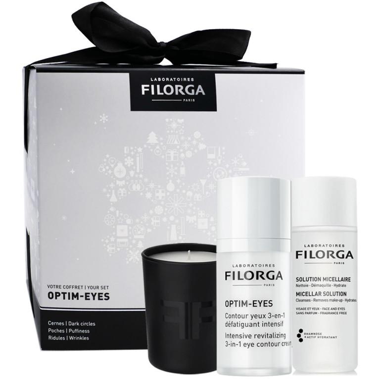 Le Coffret « Optim-Eyes » de FILORGA dans votre parapharmacie en ligne à prix discount, 2 soins inspirés de la médecine esthétique aux vertus anti-âge et anti-fatigues puissantes essentiels pour préserver la jeunesse de la peau et défatiguer le regard : Optim-Eyes soin contour des yeux (15ml), Micellar Solution solution micellaire (50ml. Visage, Yeux. Avec bougie