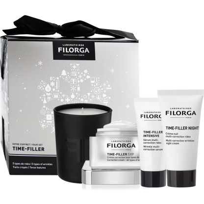 Le Coffret « TIME-FILLER » de FILORGA dans votre parapharmacie en ligne à prix discount, 3 soins inspirés de la médecine esthétique aux vertus anti-âge pour lutter contre les rides, et redonner de l’éclat au visage et au regard : Time Filler Soin de jour 5XP (50ml), Time Filler Night (15 ml), Time Filler Intensive (7ml). Visage et contour des yeux. Avec bougie