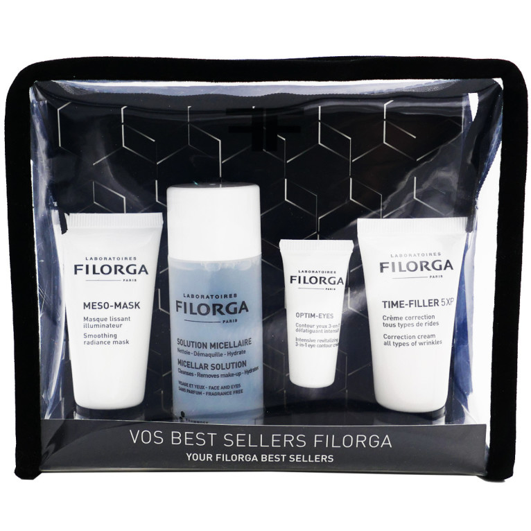 La trousse « Vos Best-Sellers » de FILORGA dans votre parapharmacie en ligne à prix discount, 4 soins découvertes format voyage, inspirés de la médecine esthétique aux vertus anti-âge puissantes essentiels pour préserver la jeunesse de la peau et défatiguer le regard : Solution Micellaire (50ml) ; Time-Filler 5XP (15ml) ; Meso Mask (15ml) ; Optim-Eyes (4ml). Visage, Yeux peaux marquées par l’âge en perte d’éclat.