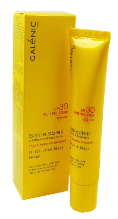 Depuis 1978, GALENIC offre le meilleur de la nature à travers sa connaissance approfondie de la physiologie cutané, et développe des produits dermo-cosmétiques haut de gamme pour accompagner les femmes exigeantes dans leur quête de beauté. La collection soins soleil propose des rituels de soins protecteurs aux textures légères délicieusement parfumées, pour profiter des bienfaits du soleil en toute sécurité. Ces soins sont composés d’un actif végétal au pouvoir photo-protecteur incomparable, l’Uncaria d’Amazonie, combiné à des filtres protecteurs stables et efficaces. Soins soleil fluide ultra-léger SPF30 de GALENIC, à la texture fine, fraîche et invisible qui fond sur la peau sans effet de gras, est spécialement conçu pour protéger le visage des peaux claires à mates, procurer douceur et confort à la peau, luminosité au bronzage.