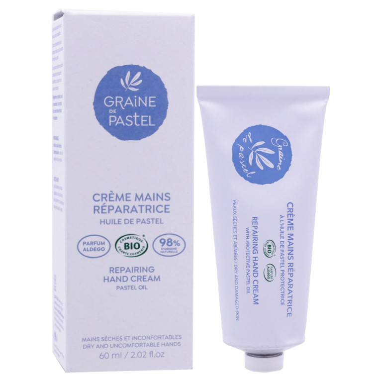Graine de Pastel Bio Crème Mains Réparatrice 60ml est en vente en ligne sur le site de votre parapharmacie à prix discount, offrant une solution idéale pour nourrir et protéger les mains sèches et abîmées.