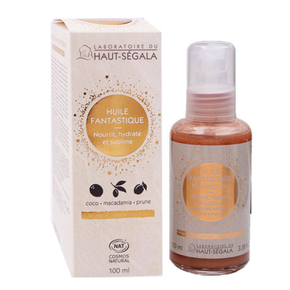 L'Huile Fantastique est un produit riche en huiles végétales et en actifs naturels qui nourrit et hydrate la peau en profondeur. Elle est composée d'huile de jojoba, d'huile de coco, d'huile de monoï, d'huile de prune d'huile de macadamia et d'huile de prune. Sa texture légère et non grasse pénètre rapidement et laisse la peau douce et hydratée avec un fini nacré léger. L'Huile Fantastique est un produit idéal pour prendre soin de votre peau et vos cheveux et leur redonner souplesse, éclat et douceur.