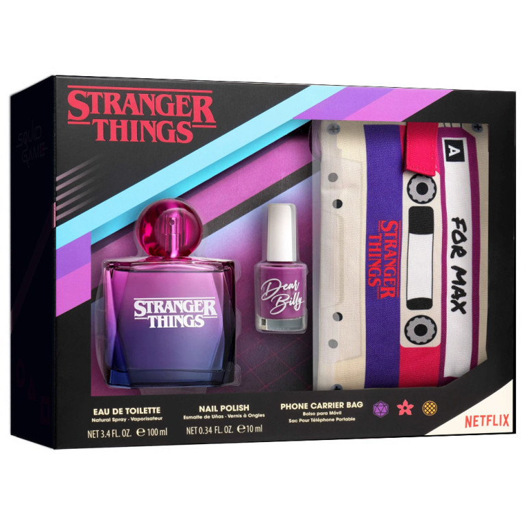 Ce coffret est proposé par la marque Netflix, connue pour ses séries originales et innovantes. Le parfum est frais et léger par ses notes de mandarine, jasmin et musc, idéal pour une utilisation quotidienne. Le vernis à ongles est facile à appliquer et offre une tenue longue durée. Le sac pour téléphone est pratique et original, parfait pour les fans de la série Stranger Things.
