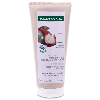 Depuis 1966, les laboratoire KLORANE développent des produits cosmétiques authentiques, efficaces, simples et sûrs, formulés avec des actifs végétaux, issus de la passion du fondateur de la marque, Pierre Fabre, pour la nature et les plantes. La ligne au Beurre de Cupuaçu Bio propose des soins capillaires hautement nutritifs, spécialement conçus pour réparer les cheveux très secs, ou abîmés. L'après Shampooing Réparation de KLORANE répare en profondeur et régénère la fibre capillaire, nourrit intensément les cheveux, rétablit force, brillance et éclat à la chevelure. Les cheveux sont doux et facile à coiffer. Testé sous contrôle dermatologique.