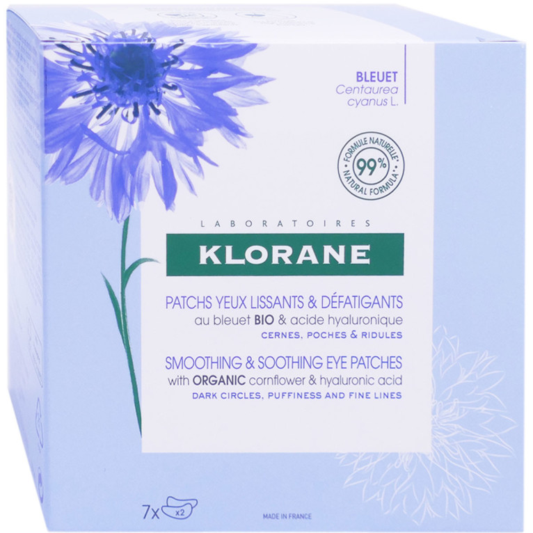 La gamme Bleuet propose des produits composés d’eau florale de bleuet apaisante, adoucissante et décongestionnante, aux formules haute-tolérance à pH identique à celui des larmes, pour assurer un démaquillage et un soin efficace et ultra-doux des yeux sensibles même porteurs de lentilles. Les Patchs Lissants défatiguant de KLORANE riche en extraits de bleuet d’origine Biologique et acide hyaluronique, vont décongestionner les poches et les cernes pour atténuer les signes de fatigue autour de l’œil, lisser et détendre le contour des yeux, apaiser la peau, et redonner de l’éclat et de la fraîcheur au regard. Leur format physiologique et leur texture gélifiée permet une adhésion optimale, et de s’appliquer parfaitement au contour de l’œil. En 15 minutes, le regard est reposé et frais, les traits sont lissés et détendus, les marques de fatigue sont estompées. Testé sous contrôle ophtalmologique et dermatologique, adapté aux yeux sensibles