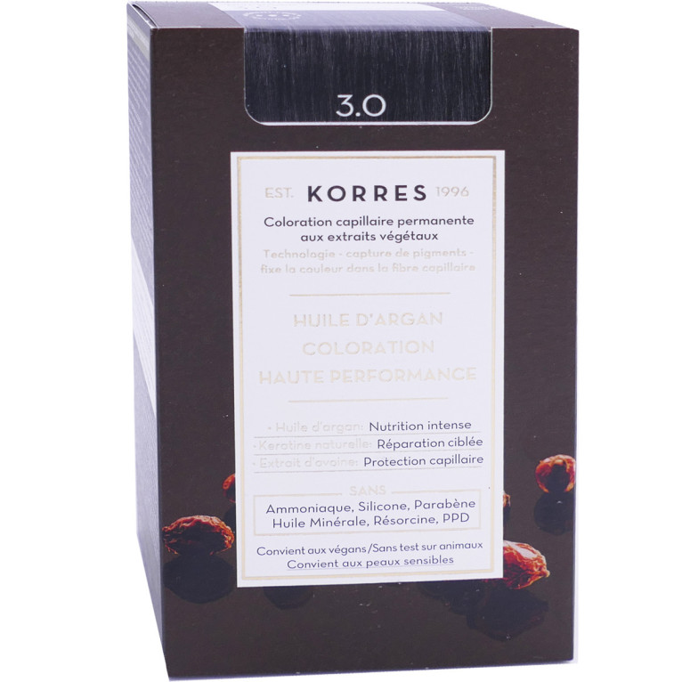 Coloration Capillaire Permanente discount de KORRES, la coloration haute performance dans votre parapharmacie en ligne à prix discount, pour assurer couleur intense, brillance et protection longue durée, Châtain Foncé 3.0