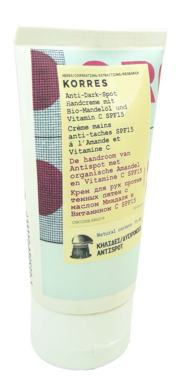 Crème mains nourrissante anti taches de KORRES, la crème qui protège et nourrit les mains avec des taches brunes