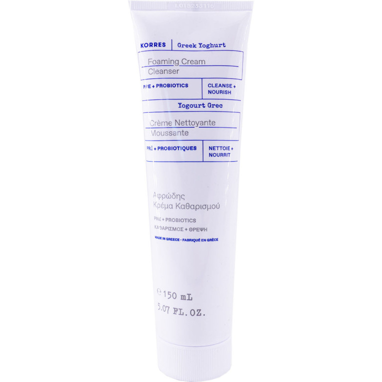 La formule de la Crème Nettoyante Moussante au yaourt grec associe des ingrédients innovants d’origine naturelle, le véritable Yogourt Grec ultra concentré en probiotiques et prébiotiques qui vont permettre de maintenir le système immunitaire de la peau, associés à un actif aux vertus anti-oxydante, détoxifiante, et apaisante : extraits d’algues marines. Un soin d’hygiène complet à la texture mousse onctueuse, qui va rééquilibrer le microbiome, protéger la peau des agressions extérieures, et maintenir une peau fraîche, saine et douce durablement. Testé sous contrôle dermatologique. Parfum 100% d'origine naturelle.