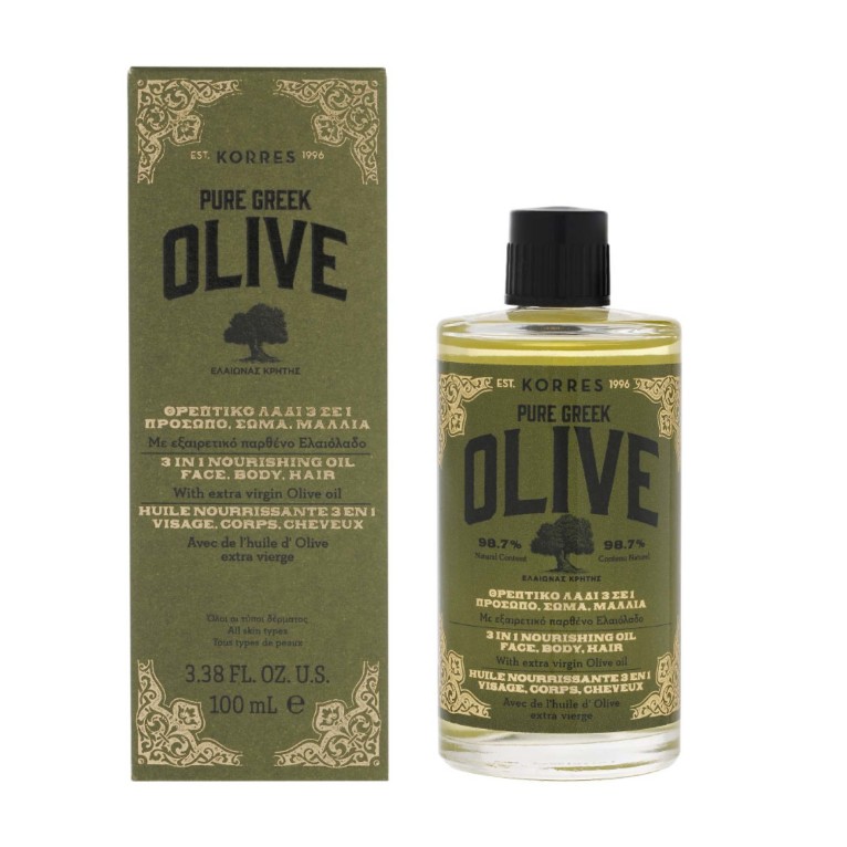 Le laboratoire KORRES conçoit des produits de beauté (cosmétiques, maquillage, crèmes,…), des parfums et des produits homéopathiques pour le bien-être au quotidien à base exclusivement de plantes et ingrédients naturels. L’Huile Nourrissante 3 en 1 Pure Greek Olive est un soin pour la peau sèche et les cheveux abîmés riche en huile d’olive vierge extra premium extraite des oliviers Crétois. L’olive est réputée pour ses vertus nutritives, hydratantes, protectrices et anti-âges. Utilisé au quotidien, l’Huile Nourrissante prendra soin de la peau et des cheveux pour retrouver douceur, souplesse, beauté et confort tout au long de la journée. La peau et les cheveux seront protégés au quotidien et retrouvent de l’éclat. Son huile non grasse pénètre rapidement pour laisser la peau et les cheveux soyeux.