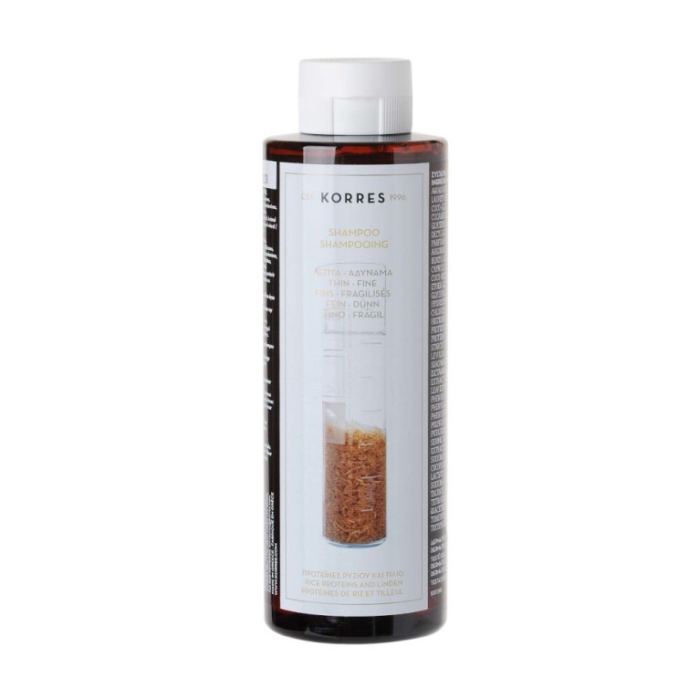 Le-shampooing Protéines de riz & tilleul de KORRES, le shampooing pour prendre soin des cheveux fins fragiles en manque de volume et leur redonner de la brillance et de la densité.