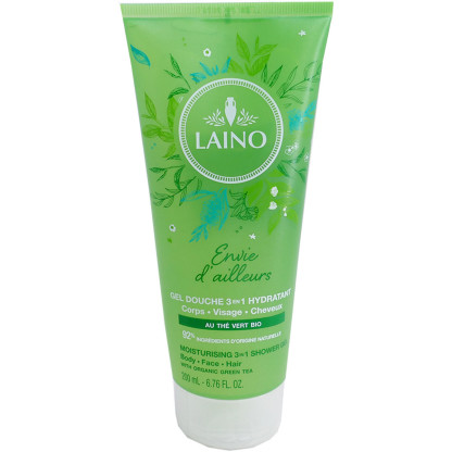 Le Gel douche Envie d’Ailleurs discount de LAINO, authenticité et naturalité, pour un soin d’hygiène 3 en 1 au Thé vert Bio conçu pour laver la peau et les cheveux en douceur et transformer la douche en parenthèse plaisir, dans votre parapharmacie en ligne discount. Cheveux, visage et corps