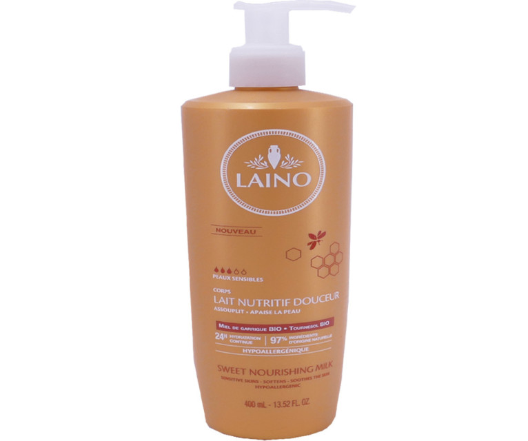 Depuis 1953, la marque LAINO fidèle à ses engagements d’authenticité et naturalité, développe des produits cosmétiques sûrs, efficaces, composés d’ingrédients naturels, simples et traditionnels : argile, pierre d’alun, huile d’olive, savon de Marseille, huile d’amande douce… La gamme des Soins nourrissants de LAINO propose des soins nourrissants (lait, crèmes, baumes) spécialement conçus pour rétablir le confort de toutes les peaux (sèches, extra-sèches, atopiques, normales, sensibles). Le Lait Nutritif Douceur est riche en miel de garrigue bio antioxydante, hydratante et revitalisante, de l’huile de tournesol bio et cire d’abeille relipidantes et régéénrante, et de glycérine hydratante et adoucissante. La peau est protégée, nourrit, tonifiée, et intensément hydratée pendant 24 heures, elle retrouve confort, douceur et souplesse. Sans paraben, sans phénoxyéthanol, hypoallergénique.