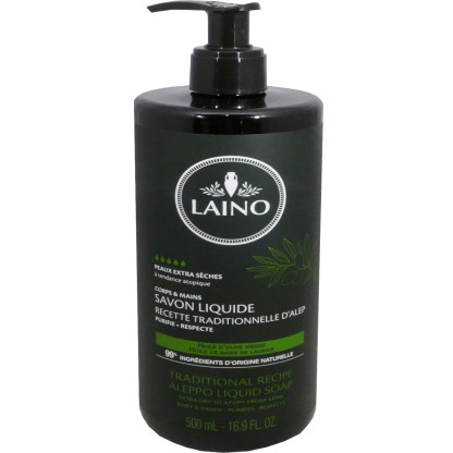 Depuis 1953, la marque LAINO fidèle à ses engagements d’authenticité et naturalité, développe des produits cosmétiques sûrs, efficaces, composés d’ingrédients naturels, simples et traditionnels : argile, pierre d’alun, huile d’olive, savon de Marseille, huile d’amande douce… La gamme des Savons liquides de LAINO propose des soins d’hygiène spécialement conçus pour rétablir le confort de toutes les peaux (sèches, extra-sèches, atopiques, normales, sensibles). Le Savon liquide d’Alep est riche en huile d’olive vierge qui contient des acides gras essentiels pour ses propriétés nourrissantes et relipidantes et de l’huile de baies de laurier purifiante et régénérante. Fabriqué en Syrie selon la méthode traditionnelle, le Savon liquide d’Alep nettoie tout en douceur la peau et la protège de tout inconforts instantanément et pour longtemps. La peau est protégée de la sécheresse et intensément hydratée pendant 24 heures, elle retrouve confort, douceur et souplesse. Sans paraben, sans parfum, sans phénoxyéthanol, sans conservateur, sans colorant. Hypoallergénique