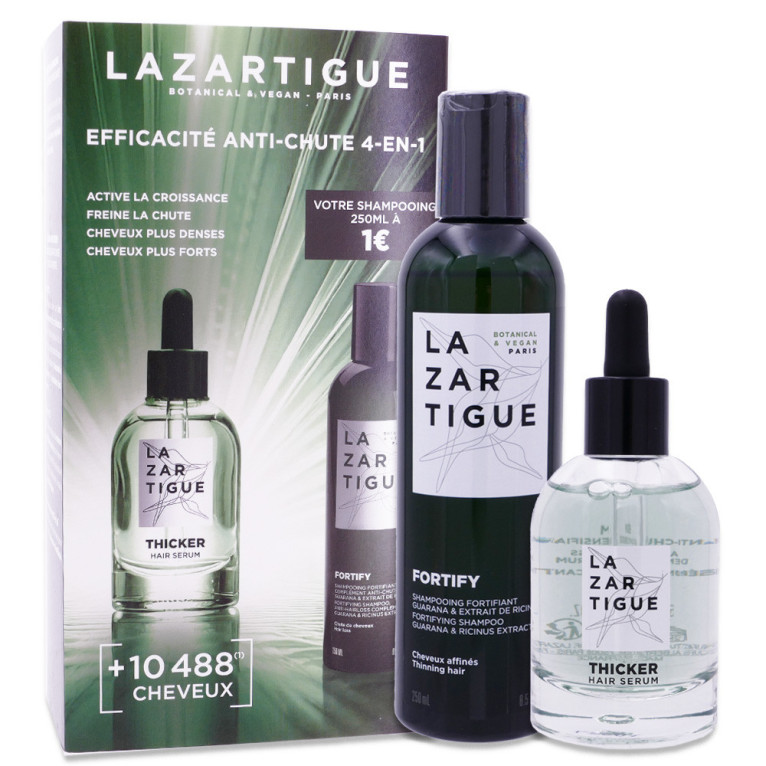 LAZARTIGUE COFFRET ANTI CHUTE 4 EN 1 SHAMPOOING + SERUM THICKER est en vente en ligne sur le site de votre parapharmacie à prix discount, conçu pour le soin des cheveux en perte de densité.