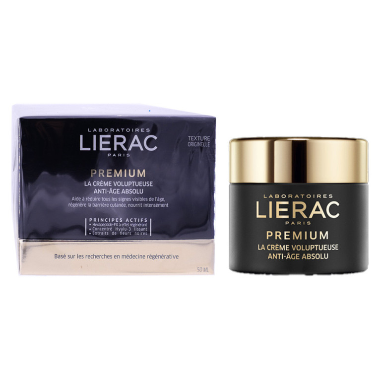 LIERAC est la première marque française dermo-cosmétique spécialisée dans la correction du vieillissement et des désordres cutanés, et instauratrice de la « cosmétique technique » qui allie plaisir des sens et efficacité. La gamme PREMIUM est constituée de soins anti-âge d’exception, aux galéniques sensorielles, inspirés de la médecine régénérative et développés pour apporter une réponse efficace aux signes du vieillissement cutané : rides, perte de densité, relâchement, teint irrégulier... PREMIUM la crème voluptueuse de LIERAC, à la texture onctueuse et fondante pour un fini velouté, est spécialement conçue pour nourrir, réconforter la peau et corriger de façon globale les signes de l’âge : les rides s’atténuent, le teint s’éclaire, les taches sont moins visibles, la peau est raffermie et son grain est affiné. Sa composition associe des actifs ultra performants : le complexe Premium Cellular breveté LIERAC dosé à 8,5% : Hexapeptide FX, Terpenoïde, extraits de fleurs noires rares (orchidée noire, rose Black Baccara, pavot noir), de l’acide hyaluronique pur dosé à 5% et un concentré nutritif dosé à 20 %. Résultats visibles en 4 semaines. Testé sous contrôle dermatologique, non-comédogène, sans paraben.