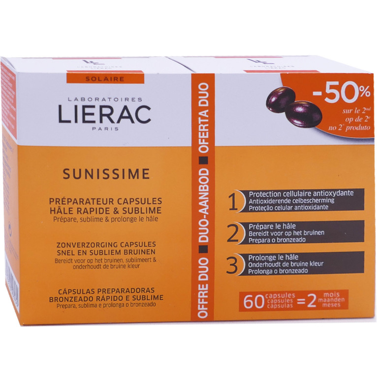 SUNISSIME Préparateur Capsules Hâle Rapide et Sublime de LIERAC à prix discount, un complément alimentaire conçu pour préparer la peau à l’exposition solaire dans votre parapharmacie en ligne discount, et sublimer le bronzage. Offre duo 2 X 30 capsules pour 2 mois.