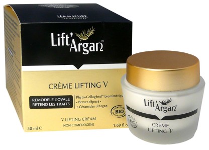 Crème Lifting V est un soin anti-âge concentré composé de Phyto-Collagénol biomimétique qui est un brevet Lift’Aragan, de céramides d’argan ainsi que d’huile d’argan. Ces actifs vont favoriser la bonne production du collagène pour un effet tenseur et raffermissant en apportant du collagène végétal biomimétrique, booster la néosynthèse de collagène par les fibroblastes pour un effet raffermissant, et lifter la peau instantanément pour estomper l’apparition des rides et ridules, tout en améliorant la texture de la peau, en redessinant l’ovale du visage, et en nourrissant et hydratant intensément la peau pour lutter contre la déshydratation et réconforter la peau. Sa texture crème active et fondante pénètre rapidement pour laisser la peau confortable et souple. Dès l’application, la peau est comme liftée avec une sensation d’un film qui s’étire sur l’ensemble de la zone V du visage, rides et ridules sont estompées.