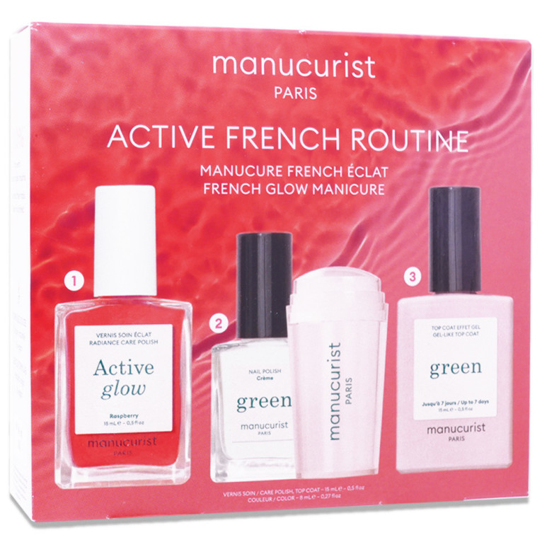 Manucurist propose ici des textures légères et faciles à appliquer, avec des finis élégants; l’acide glycolique apporte une action exfoliante cosmétique, l’huile d’amande douce contribue au confort, l’extrait de feuilles de framboisier participe à l’aspect soin, et la vitamine E offre une fonction antioxydante cosmétique. Le coffret réunit les essentiels de la routine Active French avec un produit de préparation pour lisser l’aspect de l’ongle, un soin coloré pour un rendu french naturel et un produit de finition pour apporter de la brillance, le tout dans un format pratique à utiliser au quotidien.
