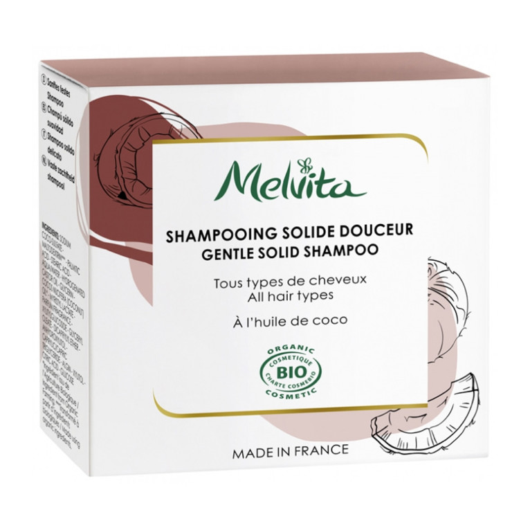 Shampooing Solide Douceur discount de MELVITA, toute la beauté de la nature dans votre parapharmacie en ligne à prix discount, au cœur d’un soin d’hygiène capillaire zéro déchet composé d’huile de coco destiné à tous les types de cheveux.