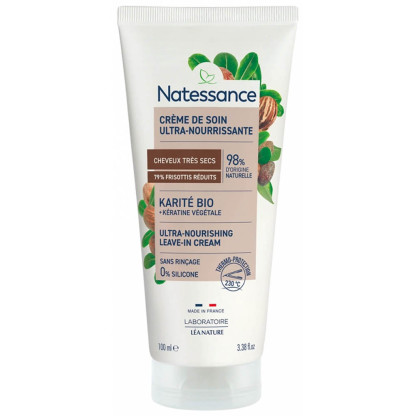 NATESSANCE KARITE BIO CREME SANS RINCAGE 100ML est en vente en ligne sur le site de votre parapharmacie à prix discount, et constitue une crème sans rinçage idéale pour nourrir et protéger les cheveux secs et abîmés.