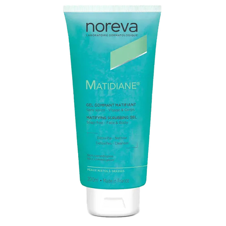 MATIDIANE gel nettoyant gommant des laboratoires NOREVA, le soind’hygiène conçu par des dermatologues pour nettoyer en profondeur et éliminer les impuretés des peaux mixtes à grasses, visage et corps.